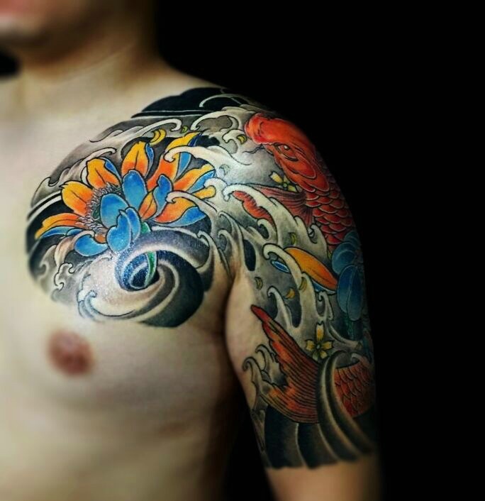 莲花与鲤鱼结合的彩色半甲纹身图片