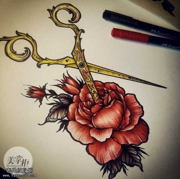 手稿玫瑰剪刀纹身图案