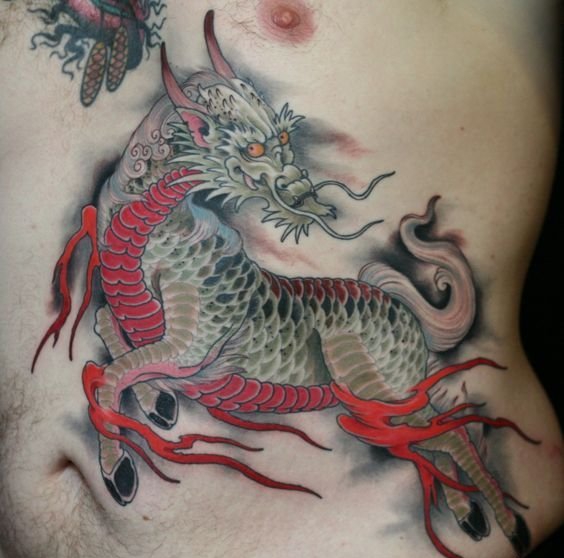 男性左侧腹部帅气的麒麟纹身图案