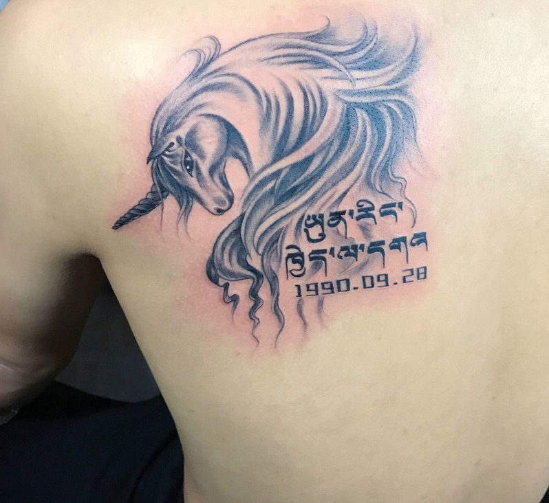 独角兽与梵文结合的背部纹身图案