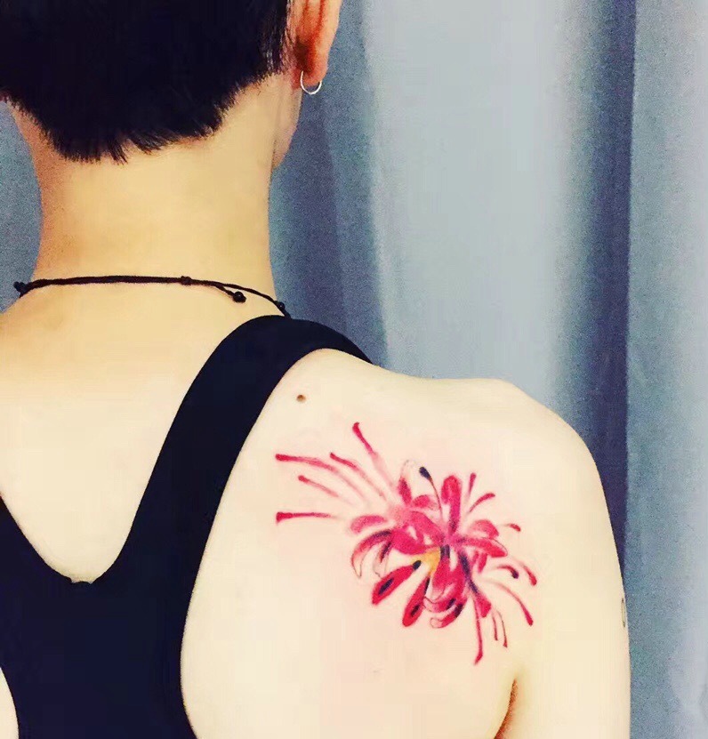 短发女生背部彼岸花纹
