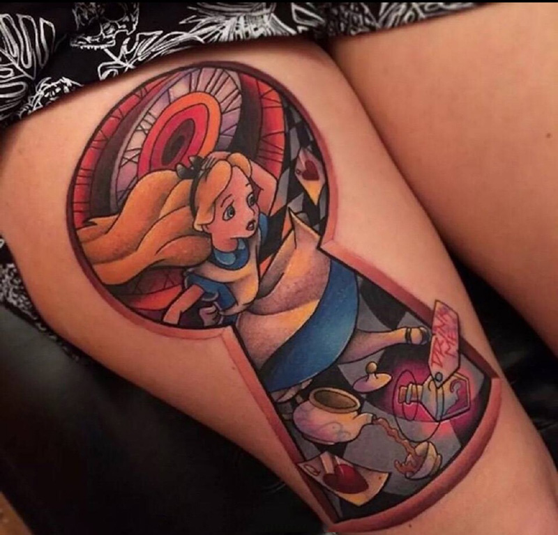 大腿卡通童话彩绘爱丽丝奇幻之旅纹身