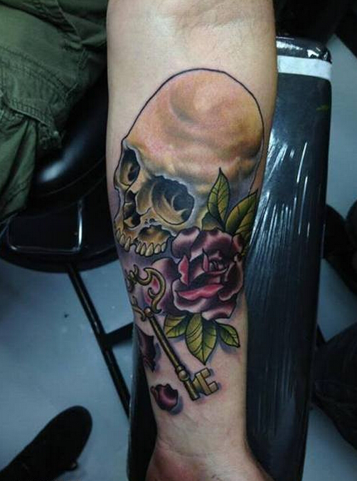 手臂彩绘骷髅玫瑰花钥匙纹身图案