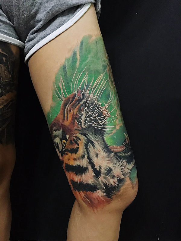大腿水彩写实怒吼的老虎纹身