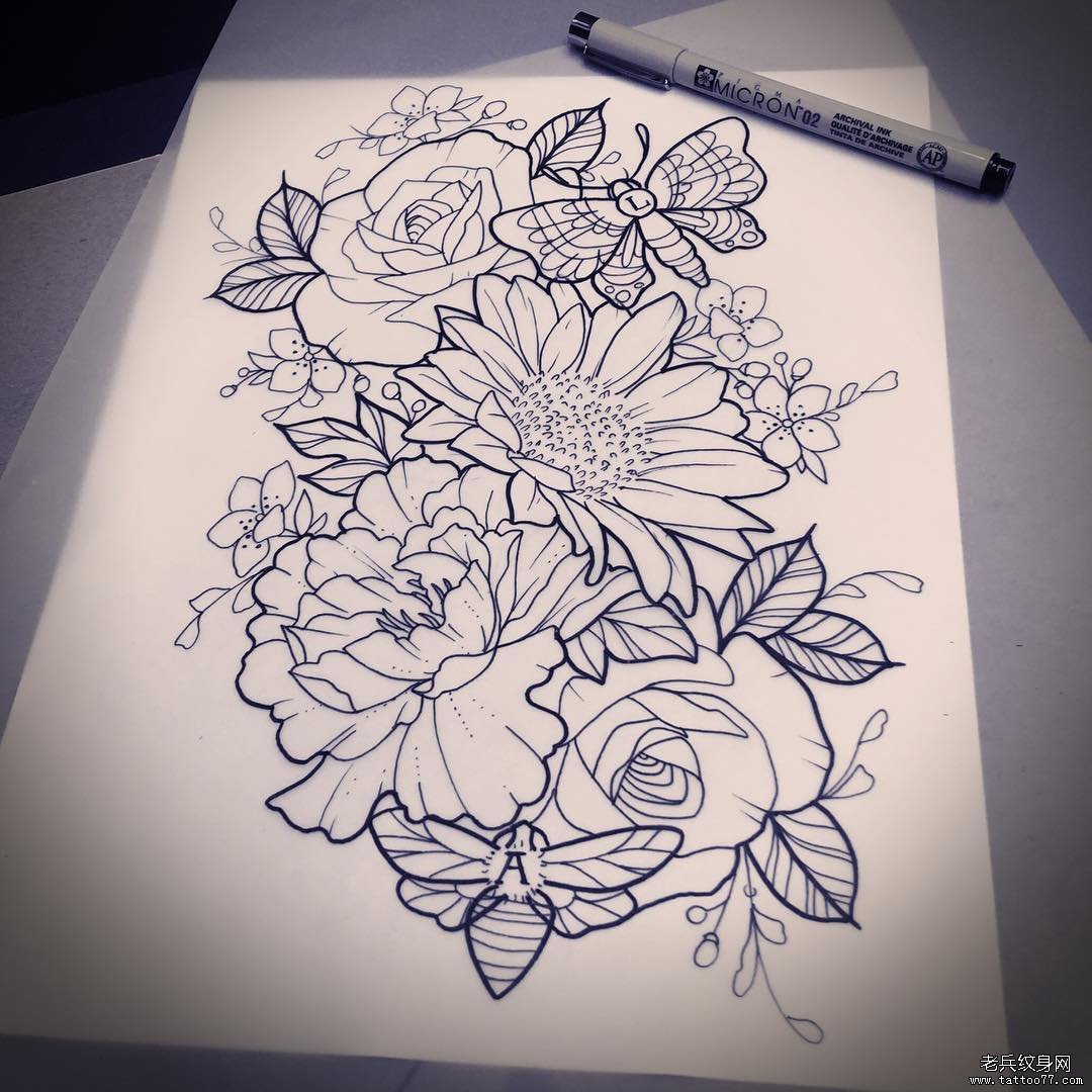 欧美玫瑰樱花蜻蜓蜜蜂纹身图案手稿