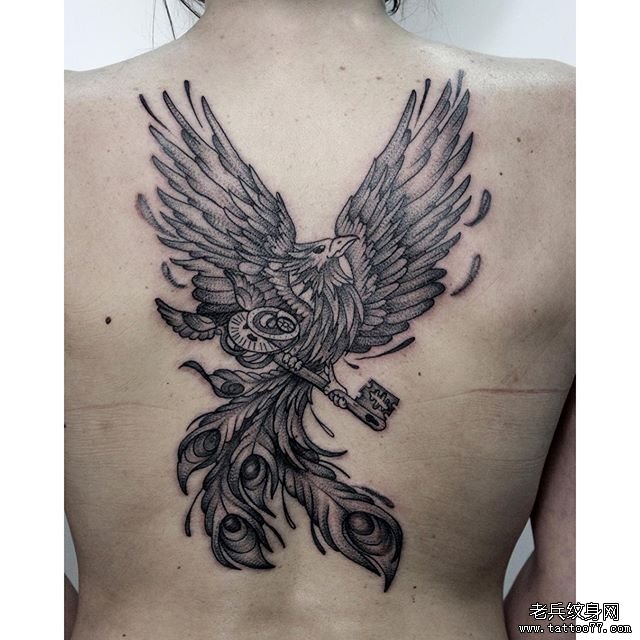 背部传统凤凰钥匙纹身图案
