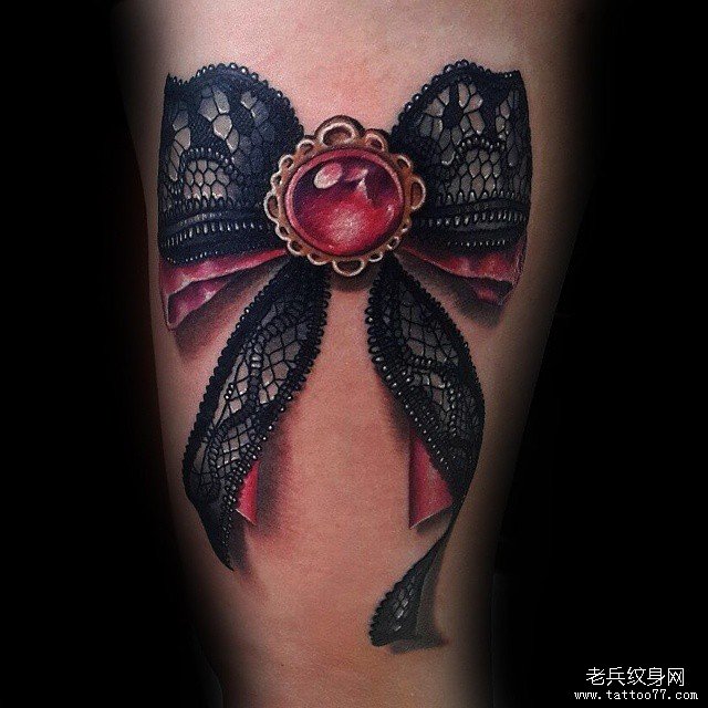 小腿写实宝石蝴蝶结蕾丝纹身图案