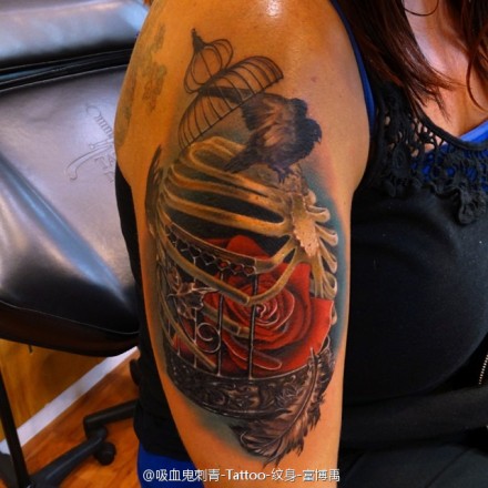 手臂彩绘笼子玫瑰和小鸟纹身图案