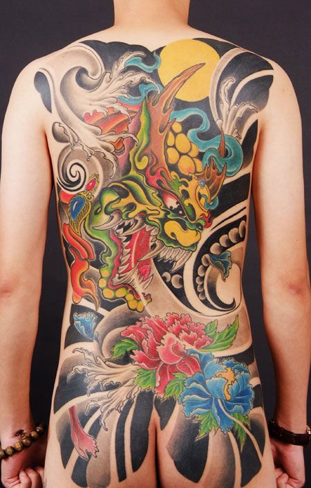 满背彩色唐狮牡丹纹身图案