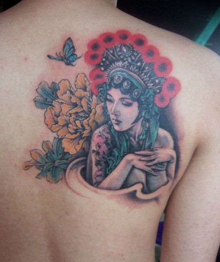 背部花旦牡丹花纹身图片