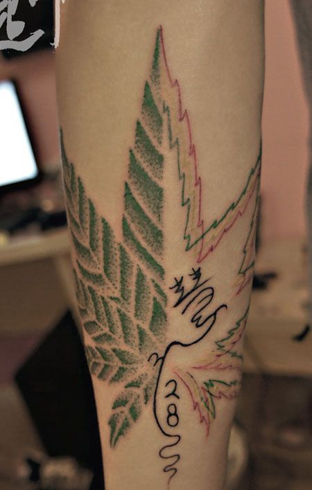 小腿树叶与文字纹身图案