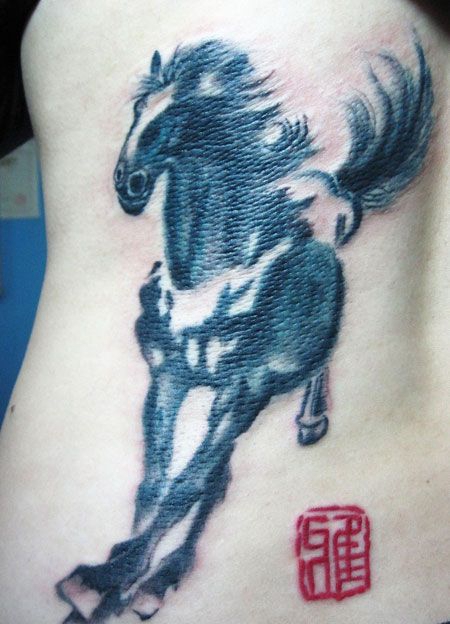 侧腰水墨马纹身图案
