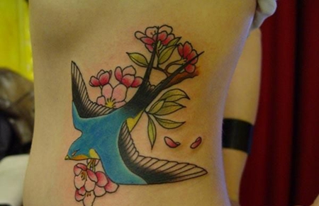 侧腰彩色樱花燕子纹身图案