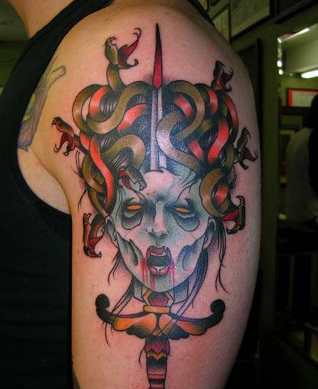 大臂上插着匕首的美杜莎纹身图案