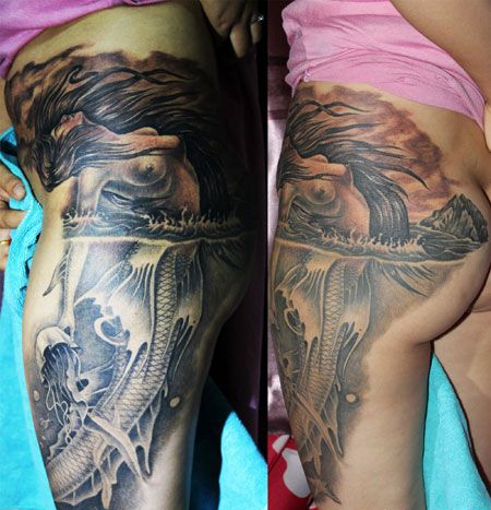 大腿好看的美人鱼出水纹身图案