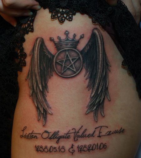 大腿翅膀皇冠纹身图案