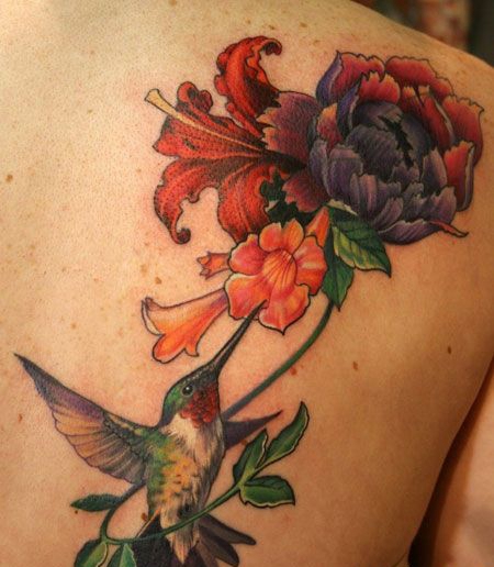 背部牡丹花蜂鸟纹身图案