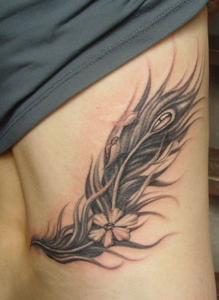 腰部羽毛与花朵的纹身