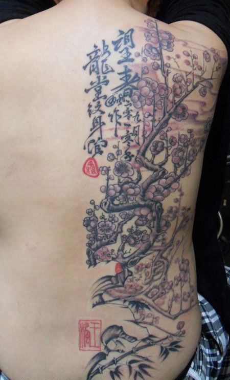 背部梅花文字纹身图案
