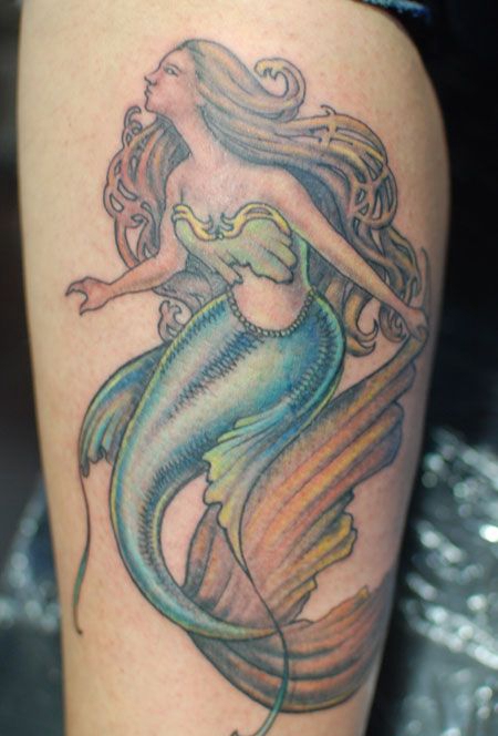 小腿彩色美人鱼纹身图案