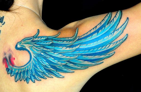 肩部蓝色翅膀纹身图案