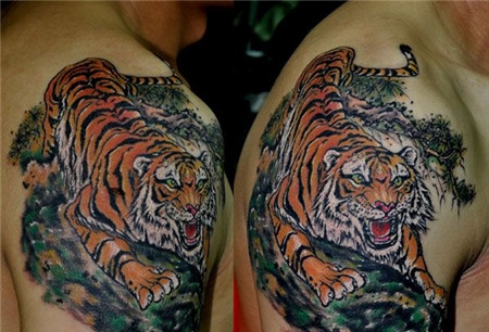 大臂上的下山虎纹身图
