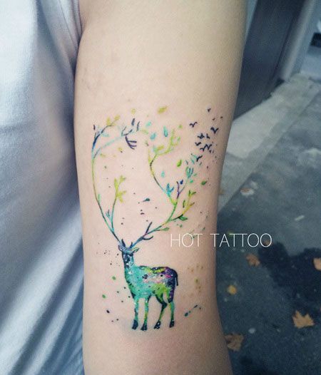 手臂小清新鹿纹身,水彩鹿和飞鸟纹身图案