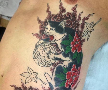 腹部日式风格猫牡丹花彩绘纹身图案