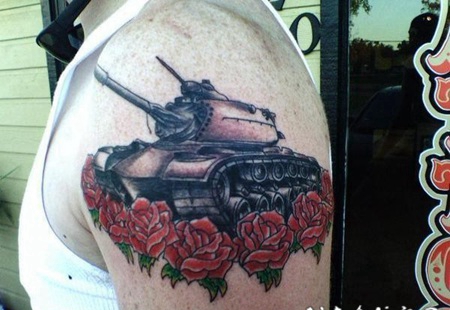手臂中型彩色的美国坦克与鲜花纹身图案