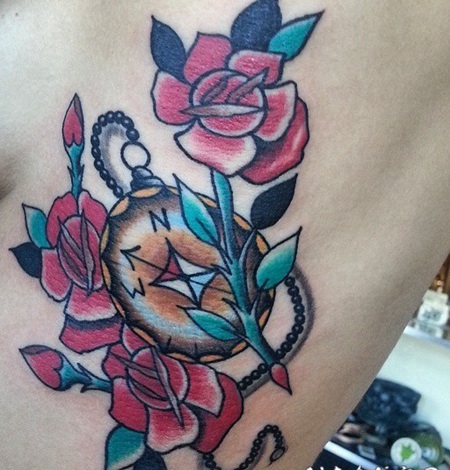 侧肋彩色经典的玫瑰和指南针纹身图案