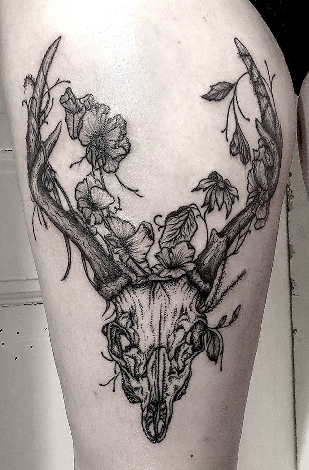 大腿花卉鹿头骨雕刻风格黑色纹身图案