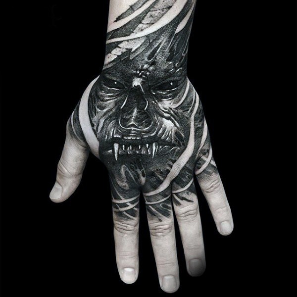 恐怖风格黑色怪物脸手背纹身图案