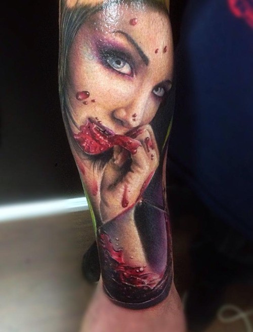 小臂彩色恐怖风格女吸血鬼纹身图案