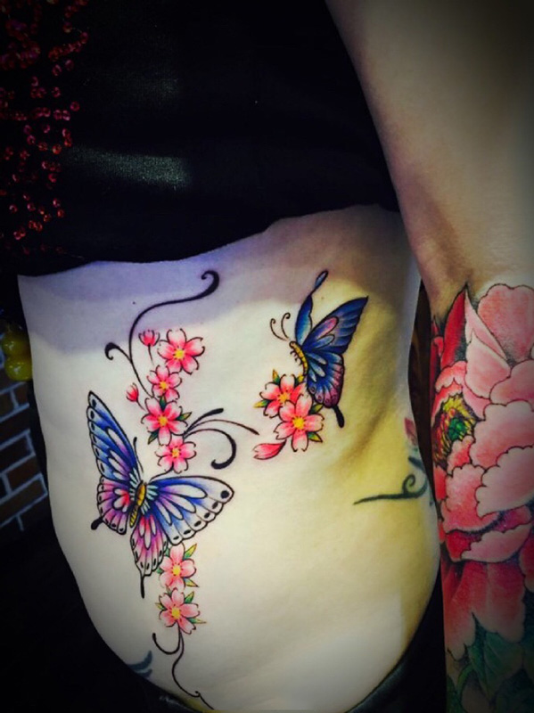 腰部美丽的蝴蝶与花蕊彩绘纹身图案