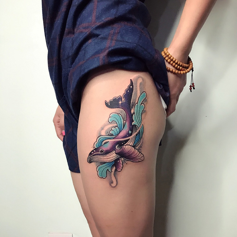 大腿漂亮的鲸鱼彩绘纹身图案
