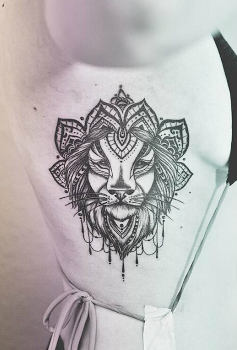 美女侧肋个性的狮子图腾纹身图案