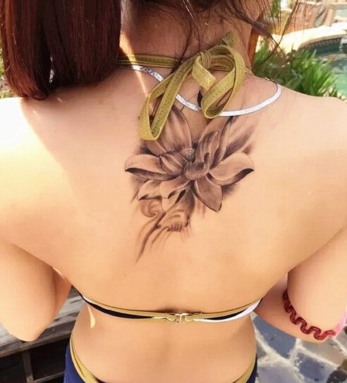 美女背部性感莲花黑灰纹身图案