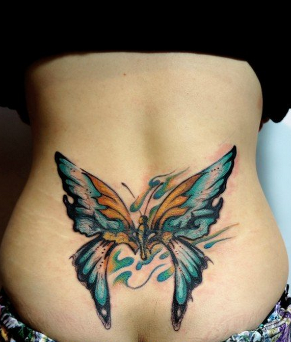 女性腰部彩色个性蝴蝶纹身图案