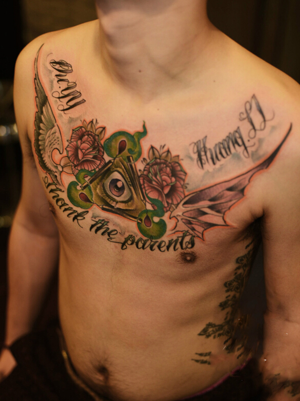 男性胸部上帝之眼翅膀玫瑰纹身图案
