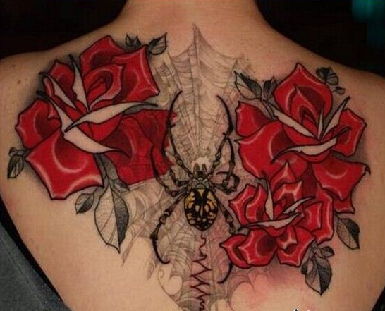女人背部妖艳玫瑰和蜘蛛纹身图案
