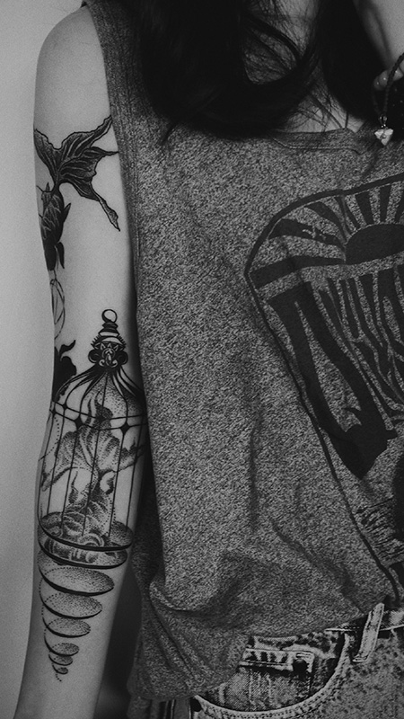 手臂金鱼鸟笼黑色点刺创意纹身图案