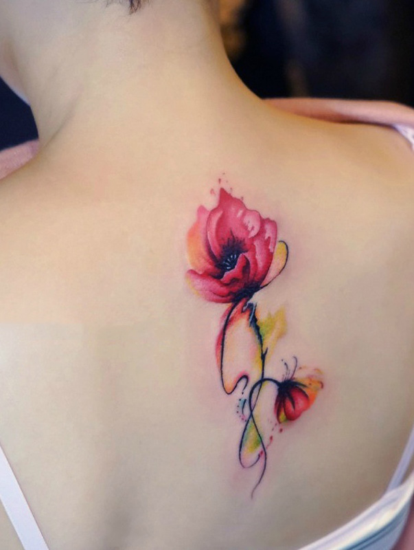 女生后背美丽的罂粟花彩绘纹身图案