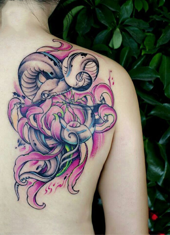 完美的搭配,后背菊花与蛇彩绘纹身