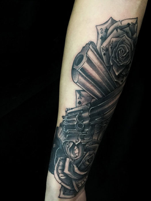 手臂扑克牌与手枪玫瑰个性纹身图案