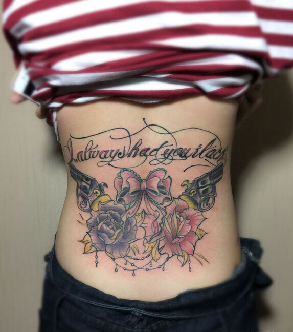 女生腰部漂亮的玫瑰手枪和字母纹身图案