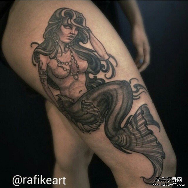 大臂欧美黑灰邪恶美人鱼纹身图案