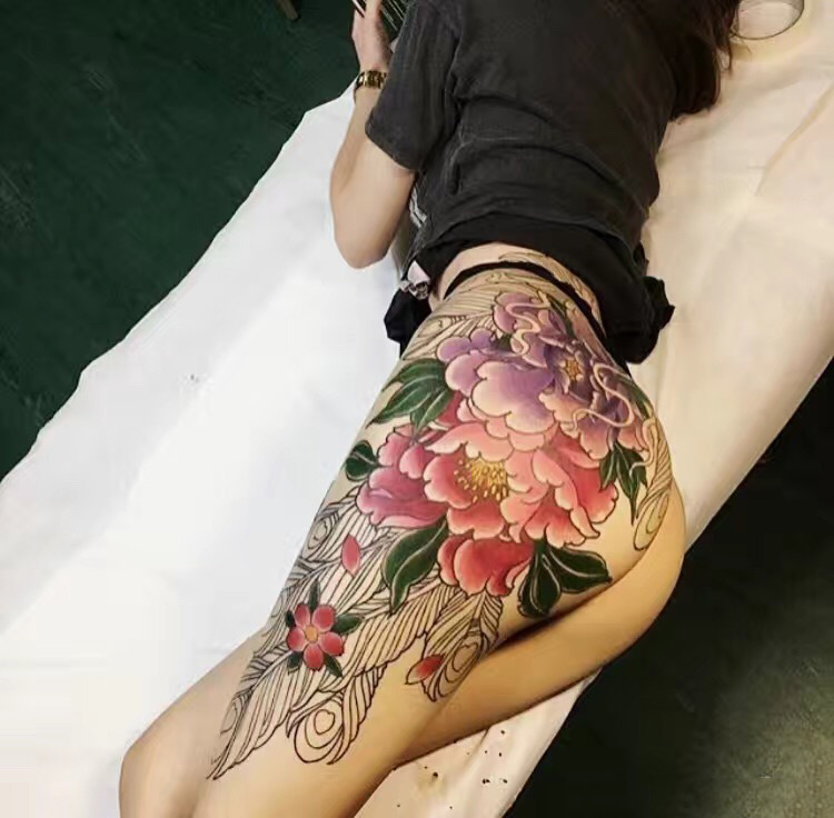 美女臀部争芳逐艳的牡丹花彩绘纹身图案