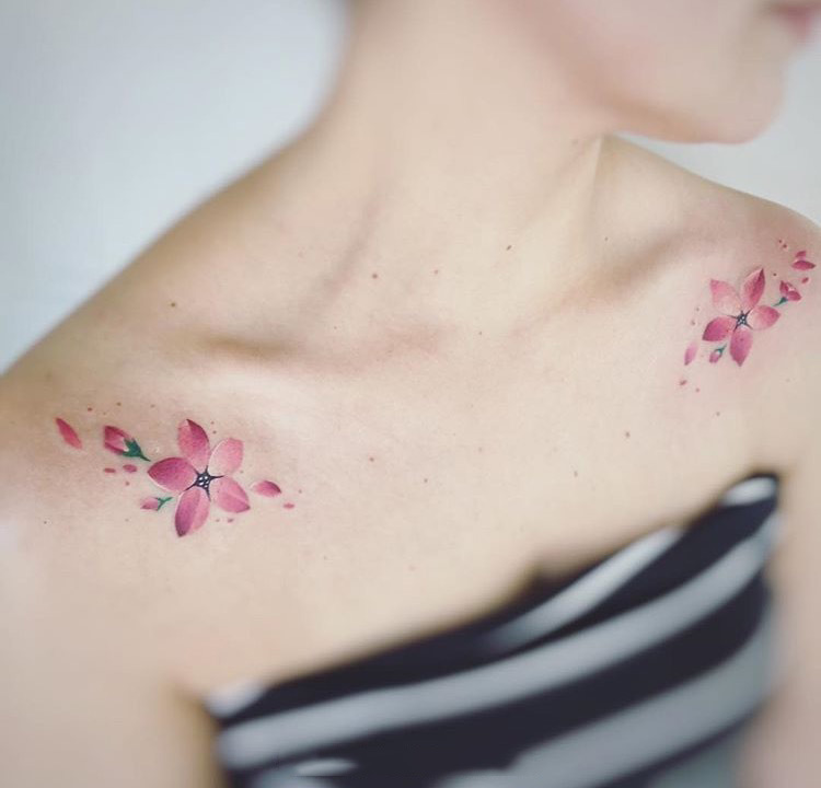 女生锁骨处好看的樱花纹身图案