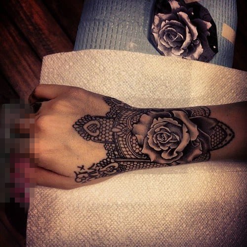 女生手臂上黑色线条素描创意玫瑰手链纹身图片
