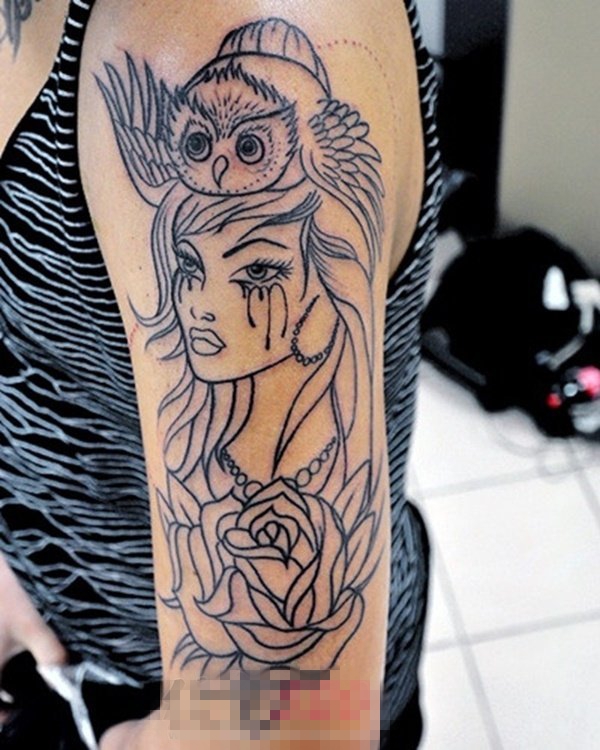女生手臂上黑色线条创意猫头鹰女生人像和花朵纹身图片